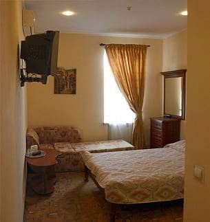В номере установлены две кровати и раскладной диван, который может использоваться как спальное место. Также в номере есть спутниковое ТВ, холодильник, санузел, кондиционер, балкон, телефон, банные принадлежности.