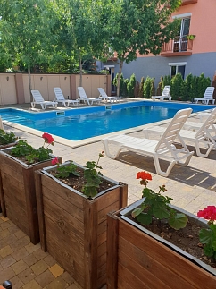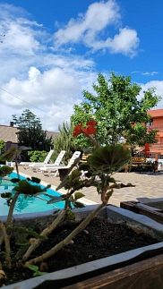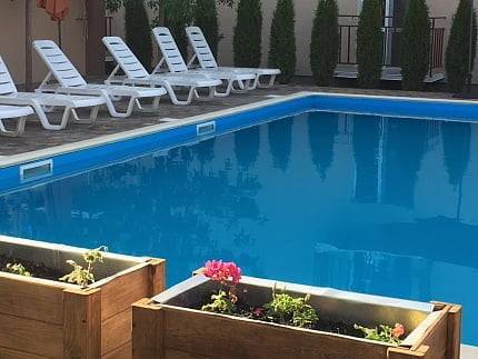 Помимо комфортабельных номеров пансионата, оборудованных зон для отдыха да и просто удачного размещения вдали от дорог и шумных машин, на территории имеется еще и бассейн. Посещение бассейна включено в стоимость проживания в пансионате. У бассейна имеются шезлонги и зонтики, что создает особый комфортный отдых для гостей пансионата. Бассейн станет Вам хорошей альтернативой морю, если вдруг погода немного закапризничает или температура воды будет недостаточно высока для Вас. Также отдых у бассейна прекрасно расслабляет, ведь можно расслабиться на шезлонге и позагорать.