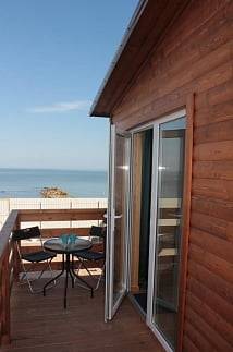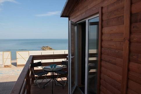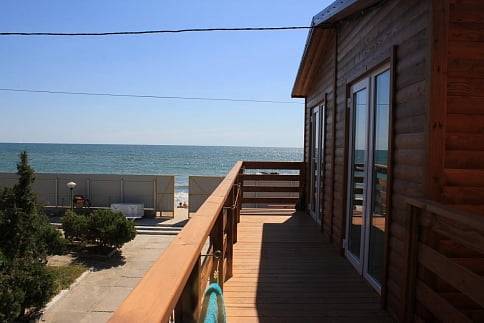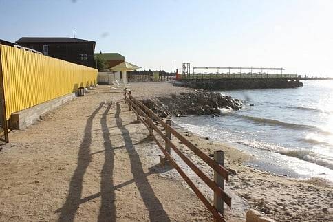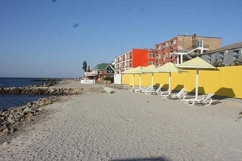 Располагается непосредственно на берегу моря (средняя коса), имеет свой чистый, песчанный, оборудованный бесплатными комфортными шезлонгами пляж, теневые навесы,