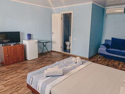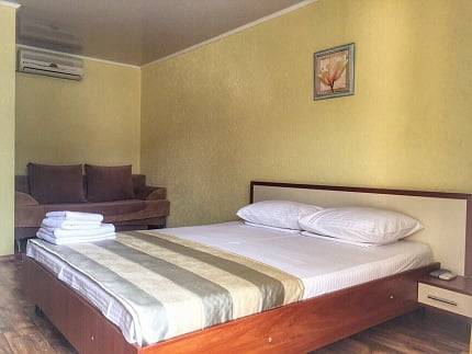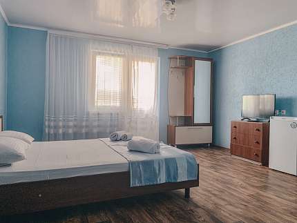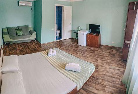 В каждом номере есть электрочайник, кондиционер, холодильник,в этом году установлены плазменные TV с приставкой Т2(32канала), душ, туалет, горячая вода постоянно, ортопедические матрасы.