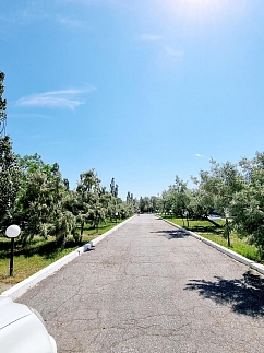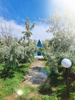 Есть летняя мебель (стол, стулья), мангал, кран с технической водой рядом с домиком; сан узел, душевая, столовая на базе; магазины и кафе рядом.