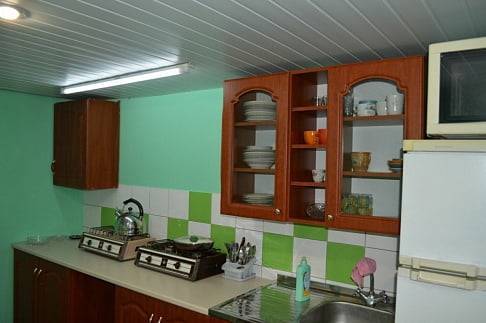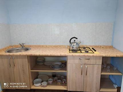 Во дворе есть общая кухня: газовая плита, посуда, чайник.