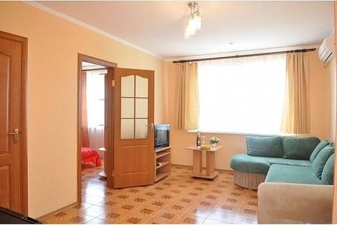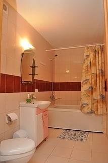В двухкомнатном номере - спальный гарнитур с двуспальной кроватью, в гостиной мягкая мебель, холодильник, телевизор, кондиционер, журнальный стол, стулья, вешалка для одежды. Санузел с ванной, горячая и холодная вода круглосуточно.