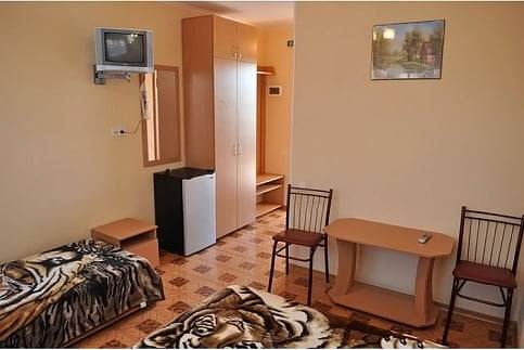 В однокомнатном номере в наличии - две кровати, шкаф, холодильник, телевизор, кондиционер, журнальный стол, стулья, вешалка для одежды. Санузел с душевой кабинкой, горячая и холодная вода круглосуточно.