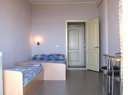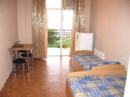 - Семейный двухкомнатный (трехместный, двухкомнатный) - две небольшие комнаты, в одной – двуспальная кровать, во второй – односпальная, можно дополнительно поставить детскую кроватку. В номере есть туалет, душевая кабина, кондиционер, телевизор, холодильник, чайник, большая лоджия со столиком и стульями. У номера отдельный вход на лоджию прямо из двора.
