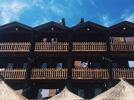 Отель построен деревянного бруса, привезенного из экологически чистых районов западной Украины.