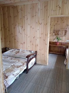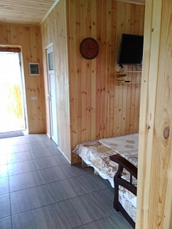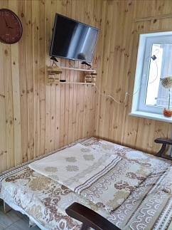 Домик из экологически чистых материалов - все в дереве . В домике - телевизор , сенсорная плита , кондиционер , холодильник , 2 кровати шириной 180 см и одна 90 см . , сану узел душевая , балкончик для отдыха , посуда , постельное ...До моря 500 метров . 3Й пляж Остров счастья , возле дома останавливается маршрутка которая везет на открытое море 7 минут .