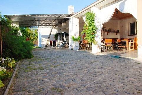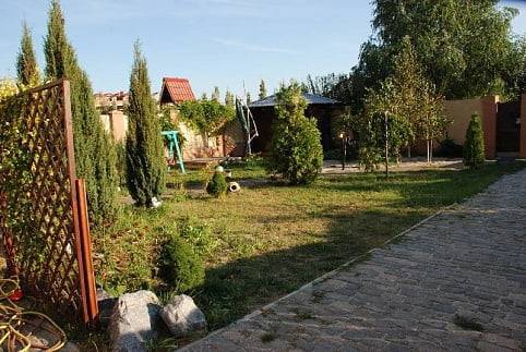 Благоустроенная и озелененная территория, мангал, беседка и место для отдыха на большой террасе с уютным уголком, подушками и большим столом.