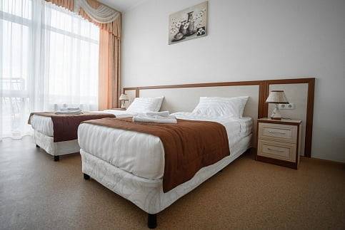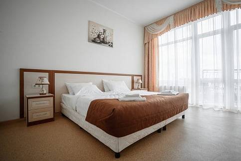 Категория номера Кол-во номеров Кол-во человек Сезон 2020 Цена, гривен/сутки + завтраки + обеды + ужины Стандарт (однокомнатный номер с одной или двумя кроватями) 72 2 2 300 Стандарт улучшенный (однокомнатный номер с одной или двумя кроватями с видом на море) 124 2 2 800 Студия "DE LUXE" 10 2 4300 Дети до 5 лет включительно размещаются бесплатно без предоставления отдельного спального места (при наличии свидетельства о рождении).