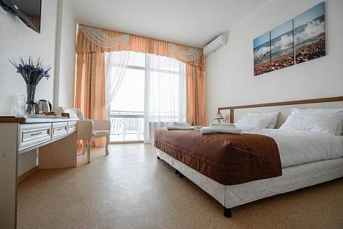 Максимум естественного света. Из окон открывается прекрасный вид на море. Номер оснащен одной двуспальной или двумя односпальными кроватями и подойдет как для семейной пары, так и для гостя который путешествует в одиночку. Также в номере есть телевизор, холодильник, кондиционер, ванная комната (душевая кабинка, умывальник, туалет).