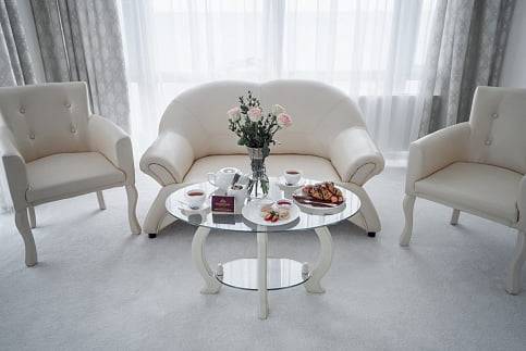 Роскошная гостиная с мягким диваном и двумя креслами может служить как зоной отдыха, так и удобным кабинетом для решения текущих бизнес-задач.