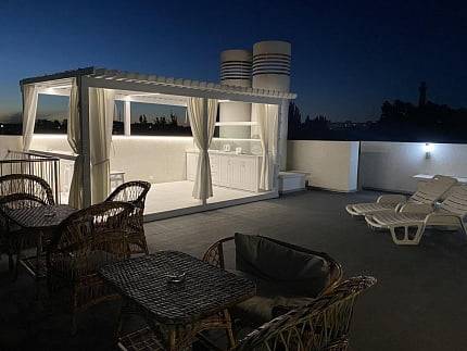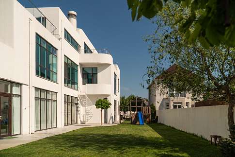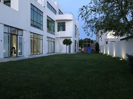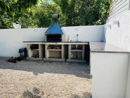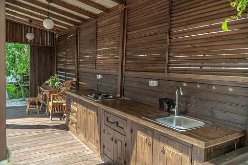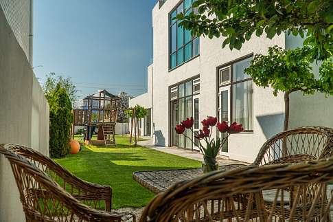 Во дворе: шезлонги для отдыха, столики, детская площадка, имеется зона барбекю.