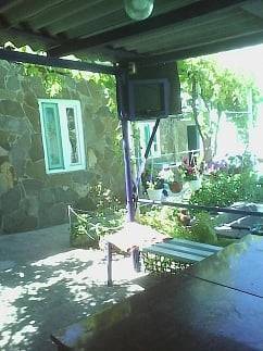 Во дворе беседка для отдыха с телевизором.