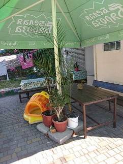 - просторный и уютный двор со столиками, мангалом, детской площадкой с песочницей и игрушками;