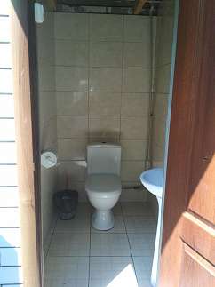 - Во дворе: озелененная территория, столики, навесы, холодильная витрина.Душ (с горячей водой), санузел.Имеется мангал и стоянка для авто.