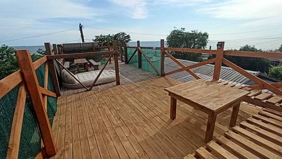 Уютные номера и двор. Пляж в 15 метрах от двора. На пляже кафе, суши бар. До центра города 15 мин пешком вдоль моря. От автовокзала 5 мин пешком. До супермаркета 10 мин пешком, за автовокзалом. До ближайшего продовольственного магазина 30 метров.