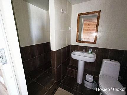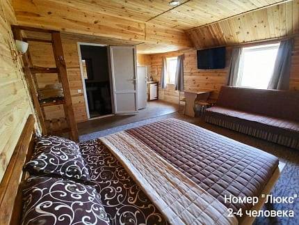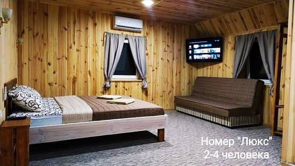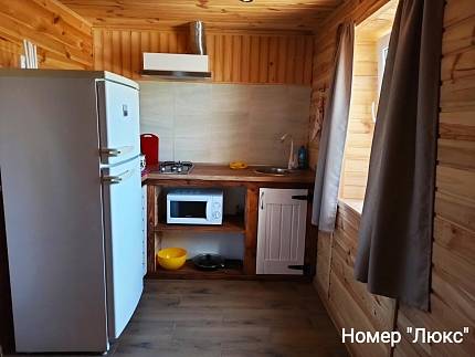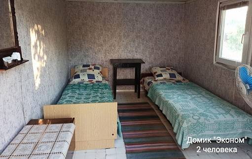 - Номер «Эконом»-отдельно стоящий деревянный домик на первом этаже. Домик рассчитан на 2 человека. В домике 2 отдельно стоящие кровати,столик,тумбочка,стул,вентилятор,Wi-fi. Кухня и санузел общие.Горячая вода от бойлера круглосуточно. На кухне есть вся необходимая посуда для приготовления еды, чайник, холодильники.