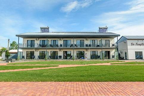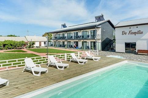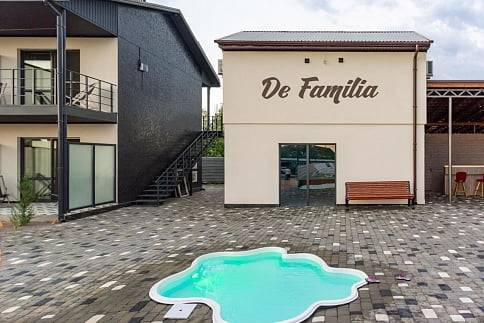 РасположениеОтель De Familia находится на дальней косе в тихом и спокойном месте на улице Литке 3, где Вам удастся отдохнуть от суеты и насладиться комфортом.ТерриторияНа территории отеля Вы сможете отдохнуть возле бассейна искупавшись или же позагорать лежа на шезлонгах. Для детей присутствует детский мелкий бассейн, где они всегда будут под Вашим наблюдением.СервисНомера отеля регулярно убираются, а дружественный персонал всегда к Вашим услугам