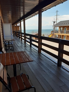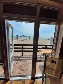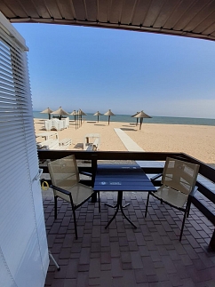 Расположен со стороны открытого моря на первой линии, свой выход на пляж и море. На пляже есть зонтики и шезлонги.