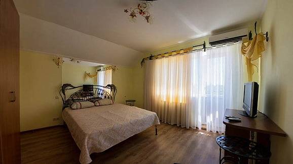 Номера двухместные, с двухспальными коваными кроватями и элементами декора. Есть возможность установки дополнительного детского места (100 грн). В номерах предусмотрены все удобства, Wi-fi, телевизор, сейф, холодильник, кондиционер. Бесплатная стоянка, мангалы и оборудованная кухня с посудой,деревянные беседки.