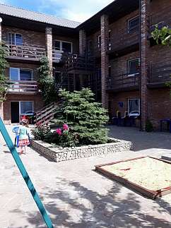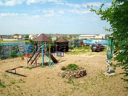 Просторный большой зелёный двор, обилие цветов, зелёные лужайки, детская площадка, качели, горка, песочница, летние столики, тенистая беседка, шашлычница-мангал, др.