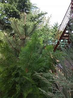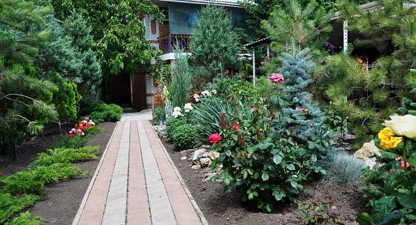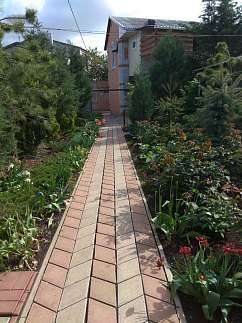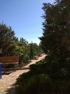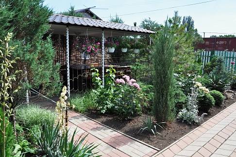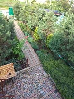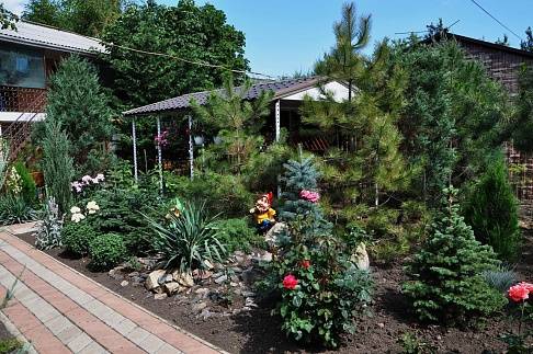Большой и уютный гостевой двор на 2 входа с большим садом исключительно из хвойных деревьев и цветов.