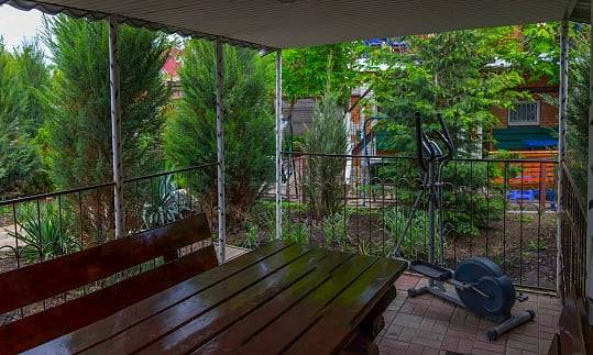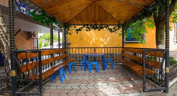 Номера на первом этаже расположены в отдельных домиках и у каждого есть свои отдельные беседки.