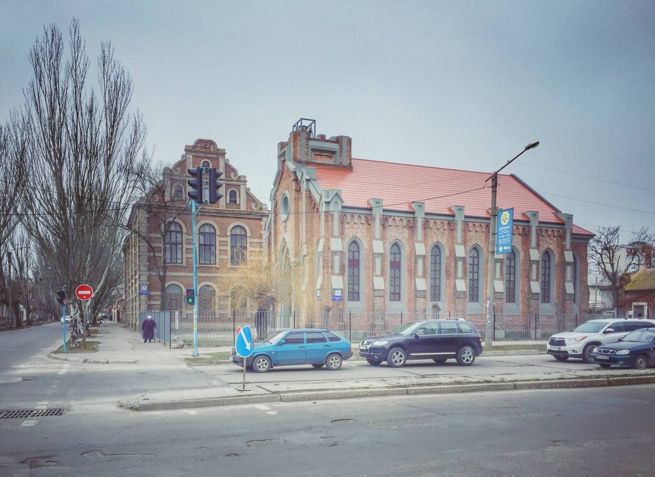 Немецкая кирха Христа Спасителя в Бердянске на перекрестке улиц Лютеранской и Центральной